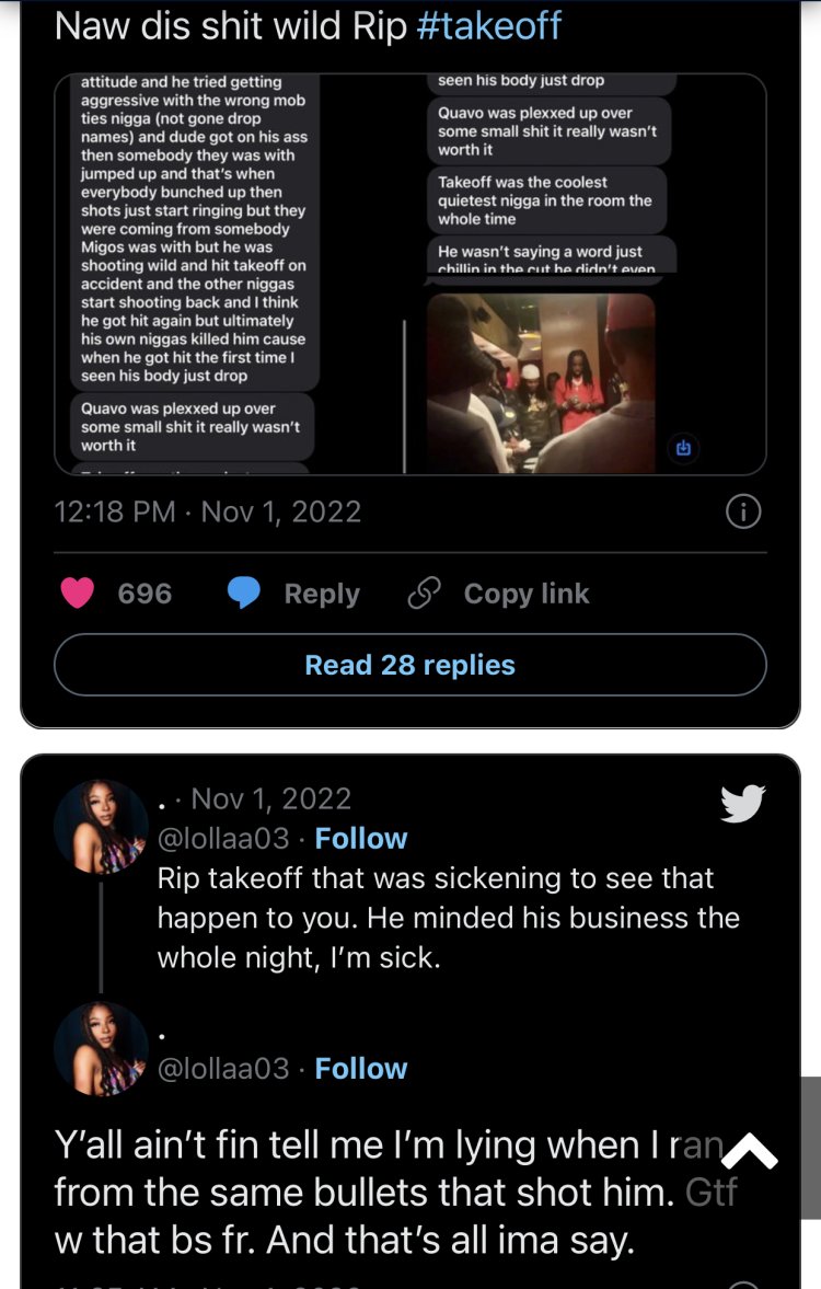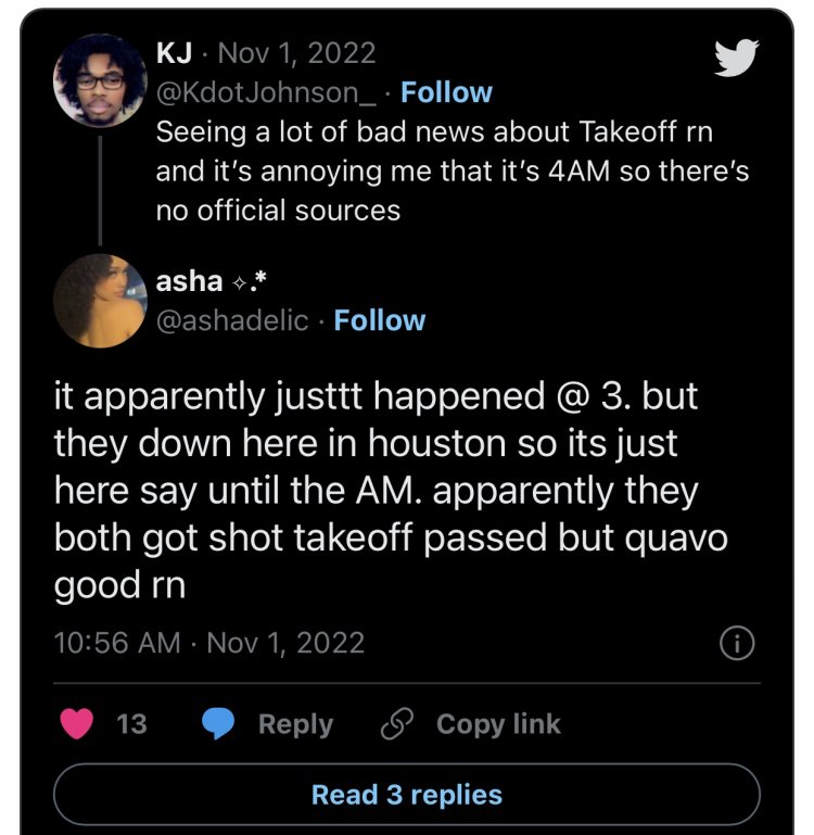 Nk’uko ikinyamakuru Onsmash cyabitangaje, umuraperi Takeoff yarashwe mu ijoro ryakeye ryo kuwa Mbere tariki 31 Ukwakira 2022 ubwo we na Quavo bari bavuye mu kwizihiza isabukuru y’amavuko y’inshuti yabo ari naho barasiwe n’umuntu utaramenyekana bikarangira Takeoff ahaburiye ubuzima naho Quavo akarokoka.