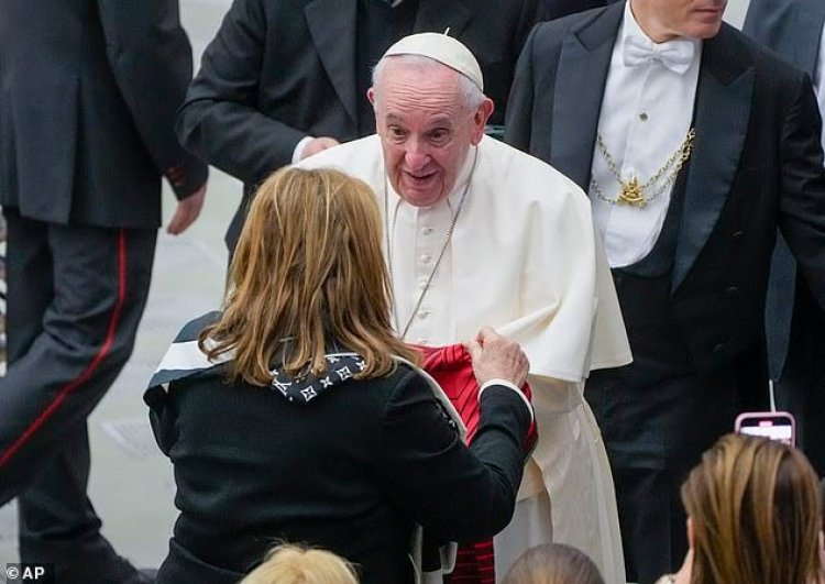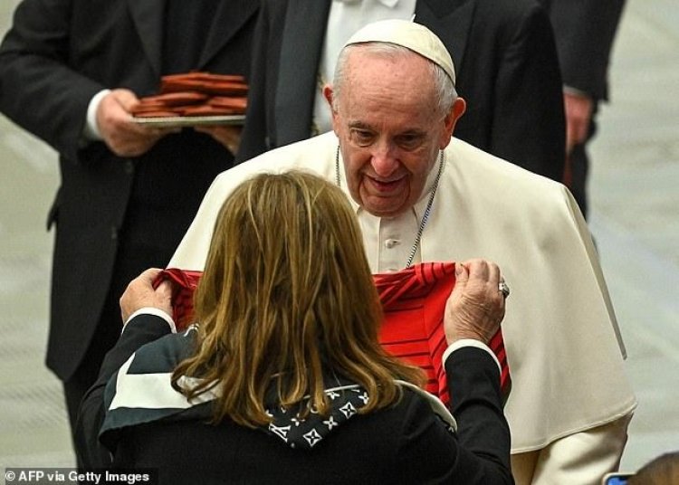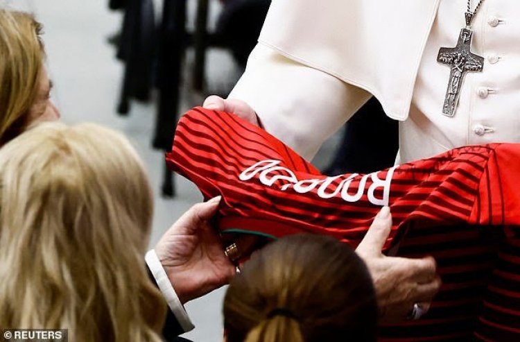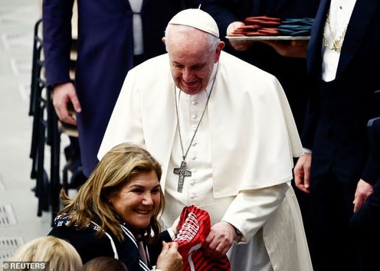 Maria Dolores yari yitabiriye Misa yabereye muri salle yitiriwe Paul wa gatanu iherereye i Vatican ahari ikicaro cy'idini gaturika maze abona umwanya wo guha Pope Francis uwo mwambaro.