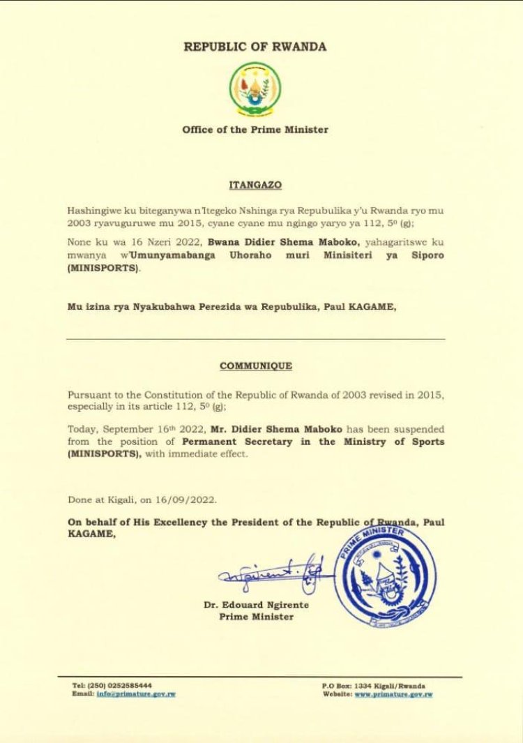 Iri tangazo riragira riti:"Hashingiwe ku biteganywa n’Itegeko Nshinga rya Repubulika y’u Rwanda ryo mu 2003 ryavuguruwe mu 2015, cyane mu ngingo yaryo ya 112. None ku wa 16 Nzeri 2022, Bwana Didier Shema Maboko, yahagaritswe ku mwanya n’Umunyamabanga Uhoraho muri Minisiteri ya Siporo (MINISPORTS)."